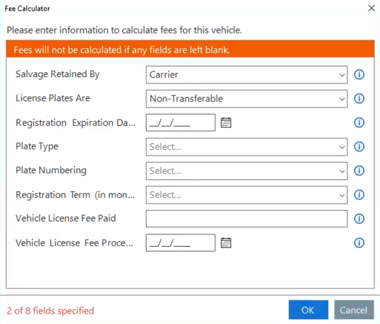 - Depending upon the vehicle selection, location selection, and company preferences, the fields that may display in the Fee Calculator pop-up include: