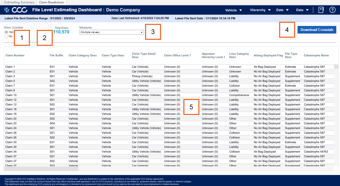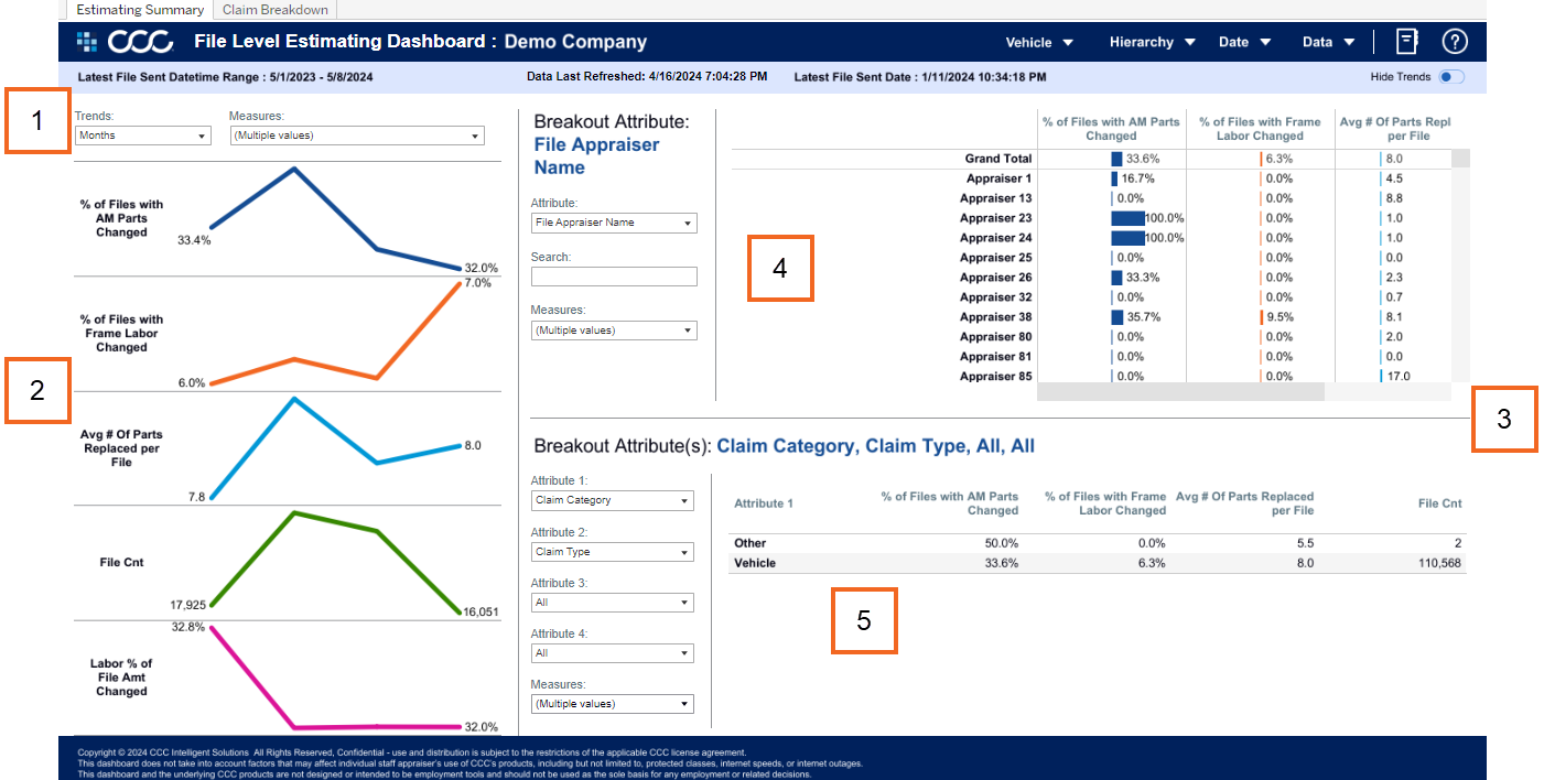 The File Level Estimating Dashboard allows users to view and measure the Repair Estimating trends over time and view details at a claim level. The dashboard provides a series of visualizations to summarize trends related to the Estimating process.
