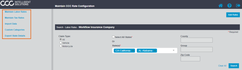 This section describes how to access the configurations settings for labor rate information. This information is used in CCC® Estimating for Insurance by appraisers. Labor rate information can be defined for vehicles and motorcycles with further refinement by state, county, and zip code.