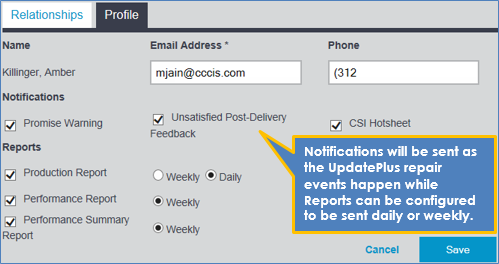 The Profile tab allows you to update your contact information and also select your Notification and Report options.