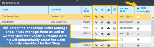 In this column, you can select whether to view that Shop’s repair data if you manage them or not. The Data Visibility column checkbox options are listed below.